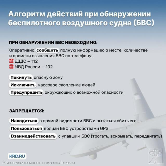 10.07.2025г. ИНСТРУКЦИЯ о порядке действий при обнаружении беспилотного воздушного судна в воздушном пространстве над территорией муниципального округа город Партизанск Приморского края | Администрация муниципального округа город Партизанск Приморского края