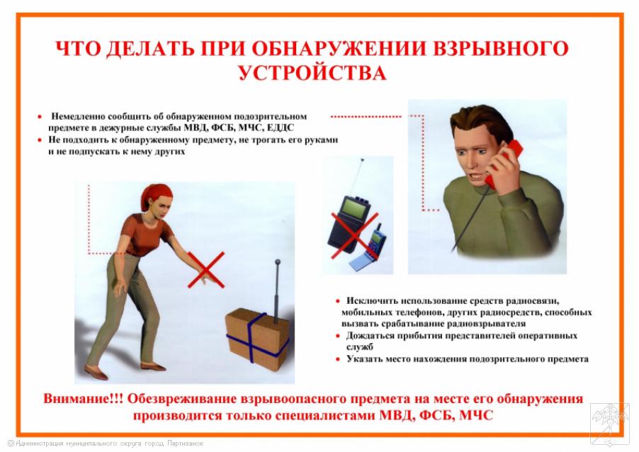 deystviya_administracii_zdaniya_pri_poluchenii_soobscheniya_ob_obnaruzhennom_v_u_10_01_2025g.docx Скачать файл. 12.73 КБ deystviya_administracii_zdaniya_pri_poluchenii_soobscheniya_ob_obnaruzhennom_v_u_10_01_2025g.docx 197 просмотров Перекрёстные ссылки книги для Действия администрации здания при получении сообщения об обнаруженном предмете похожего на взрывное устройство. 10.01.2025г. ‹ ПАМЯТКА жителям и гостям Партизанского городского округа об их действиях при установлении уровней террористической опасности Вверх Памятка по действиям при возникновении угрозы либо совершении террористического акта ›