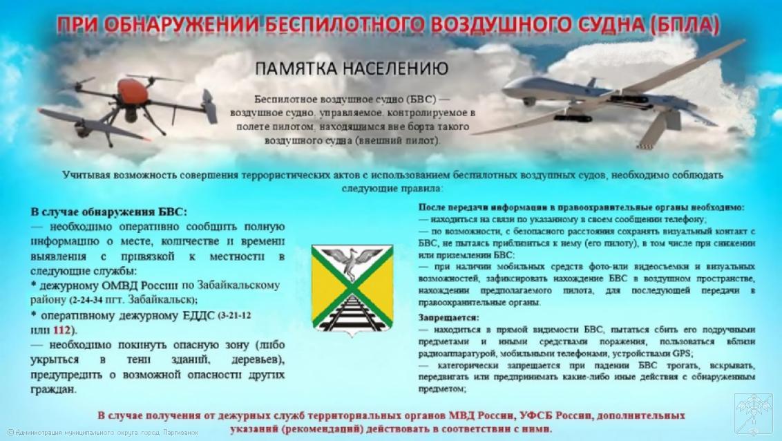 10.07.2025г. ИНСТРУКЦИЯ о порядке действий при обнаружении беспилотного воздушного судна в воздушном пространстве над территорией муниципального округа город Партизанск Приморского края | Администрация муниципального округа город Партизанск Приморского края