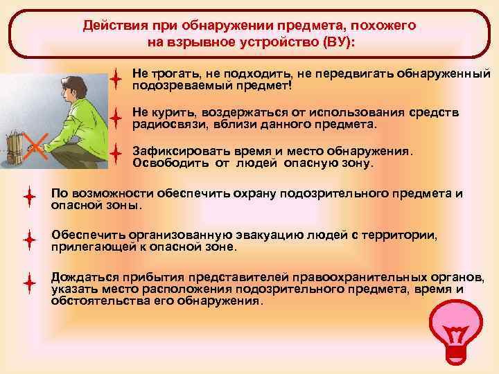 deystviya_pri_obnaruzhenii_vzryvnogo_ustroystva.docx Скачать файл. 15.61 КБ deystviya_pri_obnaruzhenii_vzryvnogo_ustroystva.docx 209 просмотров Перекрёстные ссылки книги для Действия при обнаружении предмета, похожего на взрывное устройство 01.11.2024г. ‹ Предупредительные меры (меры профилактики) при угрозе совершения террористического акта на предприятии 31.10.2024г. Вверх Действия при поступлении угрозы в письменном виде 07.11.2024г. ›